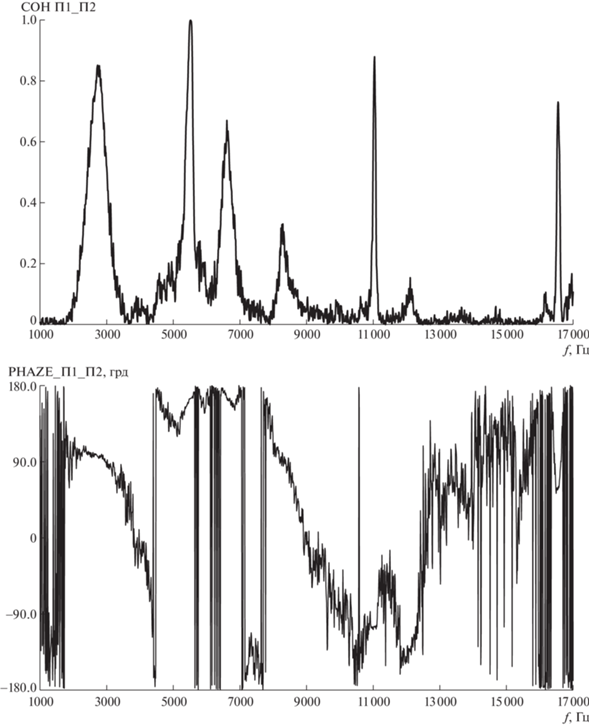 На рис. 2 и 3 приводятся результаты обработки измерений, полученных при испытаниях модели на режиме с параметрами: число Маха М∞ = 0.9, расстояние разделения dX/D = 0.5. Представлены данные по функциям спектральной плотности мощности, PSD (Power Spectral Density), когерентности (COH) и фазы (PHASE) взаимного спектра пульсаций давления для точек П1 и П2 (разрешение по частоте: 10 Гц).