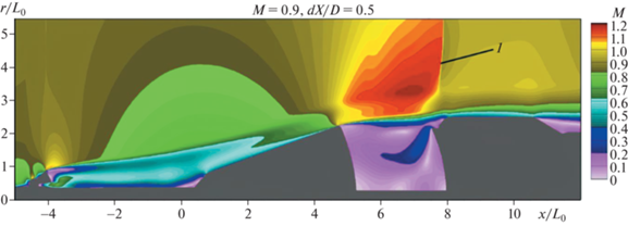 Поле осредненного числа Маха, полученное в численных исследованиях при использовании уравнений Рейнольдса: М∞ = 0.9, dX/D = 0.5. 1 – замыкающий скачок уплотнения.