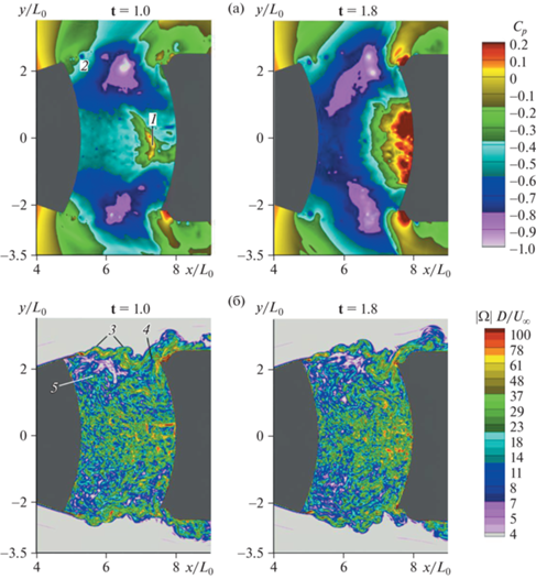 На рис. 5–7 представлены полученные в DDES-расчетах модели поля мгновенных значений коэффициента давления и безразмерного модуля завихренности, соответствующие различным моментам относительного времени рассматриваемых процессов, t (t = t/(L0/U∞)). Течение в зоне отрыва нестационарное. В момент относительного времени t = 1.0 давление на лобовой поверхности ДО начинает возрастать. Вначале это отмечается на периферийной части ДО, что обусловлено началом слива массы газа из слоя смешения. Из наиболее важных особенностей течения следует выделить (см. рис. 5): волновое возмущение 1, смещающееся от ВА к ДО; возникновение в слое смешения первого по потоку гребня волны неустойчивости со сформировавшимся вихрем 2; развитие вихрей в крупномасштабные вихревые структуры 3; их смещение вниз по потоку и деформация при взаимодействии с лобовой поверхностью ДО 4. На развитие вихревых структур оказывает влияние затекание 5 в указанные структуры массы газа из возвратного течения в зоне отрыва.
