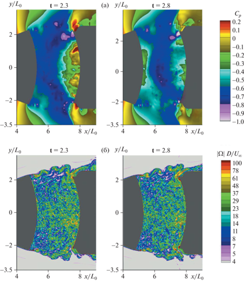 Поля мгновенных значений коэффициента давления (а) и относительного модуля завихренности (б): M∞ = 0.9, dX/D = 0.5; t = 2.3 (слева) и t = 2.8 (справа).