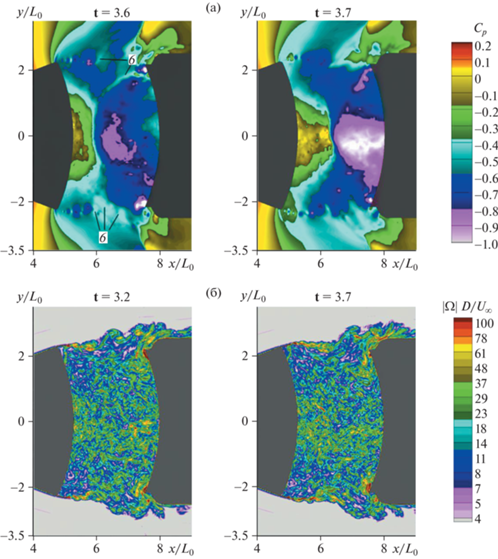 Поля мгновенных значений коэффициента давления (а) и относительного модуля завихренности (б): M∞ = 0.9, dX/D = 0.5; t = 3.2 (слева) и t = 3.7 (справа).