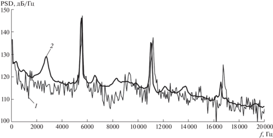 Сравнение функций спектральной плотности мощности пульсаций давления на днище ВА (r/D ~ 0.33), полученных при испытаниях и численных расчетах модели: M∞ = 0.9, dX/D = 0.5; 1 – расчет (выборка 3.55 × × 104), 2 – испытание (выборка 1.02 × 106).