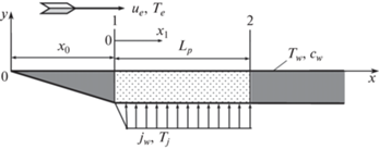 ${{j}_{w}} = {{(\rho {v})}_{w}},\quad {{j}_{w}}({{c}_{w}} - 1) = {{\left( {\frac{\eta }{{{\text{Sc}}}}\frac{{\partial c}}{{\partial y}}} \right)}_{w}},\quad j_{w}^{o} = {{j}_{w}}{\text{/}}{{(\rho u)}_{e}}$Здесь ${{j}_{w}} = {{(\rho {v})}_{w}}$ – массовая скорость вдуваемого газа, Tw – температура стенки, Tj – температура вдуваемого газа, cw – концентрация вдуваемого газа на стенке, qw – тепловой поток в стенку. Граничное условие ∂E/∂y = 0 позволяет определить величину ωw(x), которая заранее неизвестна.