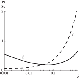 Молекулярные числа Шмидта Sc (1) и Прандтля Pr (2) в зависимости от массовой концентрации гелия c в смеси гелий-ксенон.