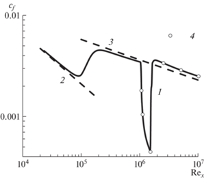 Характер изменения режима течения по длине пластины иллюстрирует рис. 3, где представлена расчетная зависимость коэффициента трения cf от числа Рейнольдса Rex.