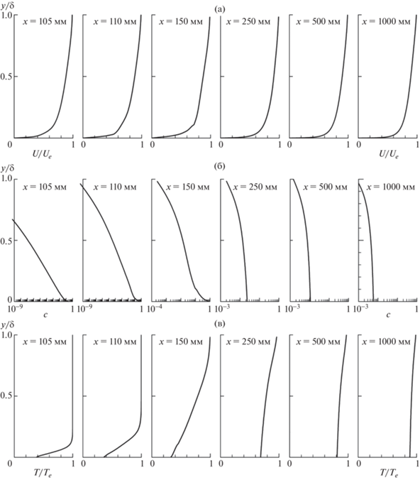 На рис. 4 приведены профили относительных величин скорости u/ue (а), массовой концентрации c (б) вдуваемого газа (гелия) в смеси с газом основного потока (ксенона) и температуры T/Te (в) в ряде сечений по длине пластины x.