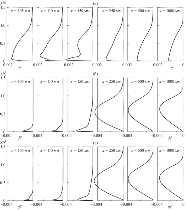 Как видно из рис. 5, характер зависимостей турбулентных потоков массы $j_{t}^{o}$ (б) и тепла $q_{t}^{o}$ (в) в пограничном слое существенно меняется при переходе из области вдува (x = 100–150 мм) в область завесы (x > 150 мм) при менее существенном изменении турбулентного трения ${{\tau }^{o}}$ (а).