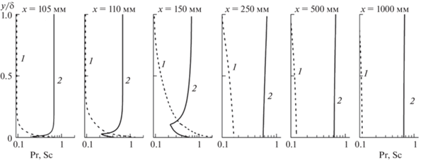 Профили молекулярных чисел Шмидта Sc и Прандтля Pr в смеси гелия с ксеноном для значений массовой концентрации гелия (рис. 4в) в ряде сечений по длине пластины x приведены на рис. 6. Как видно, профили молекулярных чисел Шмидта и Прандтля, как и профили массовой концентрации гелия (рис. 4в), существенно меняются при переходе из области вдува (x = 100–150 мм) в область завесы (x > 150 мм).