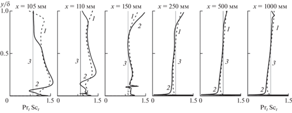 Как видно из рис. 7, зависимости Sct(y/δ) и Prt(y/δ) в области вдува (x = 100–150 мм) далеки от постоянных значений Sct = Prt = 0.85 (штриховые линии) и лишь в области завесы (x > 150 мм) при y/δ > 0.1 близки к упомянутому постоянному значению. В пристеночной области зависимости Sct(y/δ) и Prt(y/δ) в особенности очень сильно меняются.