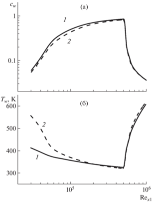 На рис. 8 приведены изменения от числа Рейнольдса, ${{\operatorname{Re} }_{{x1}}} = {{x}_{1}}{{(\rho u{\text{/}}\eta )}_{e}}$, определенного по длине x1 от начала вдува (см. рис. 1) массовой концентрации гелия cw (а) и температуры стенки Tw (б) для двух вариантов расчета: 1 – с использованием модели турбулентности (2.1)–(2.3) с уравнениями переноса для турбулентных потоков тепла (2.4) и массы (2.5) и 2 – без уравнений (2.4), (2.5) и с соотношениями для турбулентных потоков тепла (1.6) и массы (1.7) для постоянных турбулентных чисел Шмидта и Прандтля Sct = Prt = 0.85.