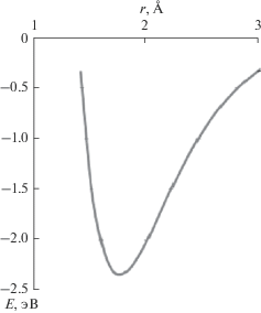 Для описания механизма поверхностной модификации бороуглеродной ВС3-нанотрубки карбоксильной группой –СООН рассмотрен фрагмент нанотрубки типа “зиг-заг” (6, 0) в рамках модели молекулярного кластера. Кластер содержал пять слоев бороуглеродных гексагонов вдоль продольной оси нанотрубки. Оборванные связи на границе кластера были замкнуты псевдоатомами, в роли которых выступали атомы водорода. Карбоксильная группа присоединялась к атому углерода, находящемуся примерно в центре кластера, для исключения влияния краевых эффектов. Процесс присоединения функциональной группы –СООН к бороуглеродной нанотрубке моделировали с использованием так называемой процедуры изменения координаты реакции, когда функциональная группа приближалась к поверхности ВС3-нанотрубки вдоль перпендикуляра к ее продольной оси, проходящего через выбранный поверхностный атом углерода, с изменением координаты на 0.1 Å. На рис. 1 приведена модель поверхностно-карбоксилированной бороуглеродной ВС3-нанотрубки (6, 0). Выполненные расчеты позволили построить энергетическую кривую, наглядно описывающую процесс взаимодействия БУНТ с карбоксильной группой –СООН (рис. 2), анализ которой показал, что величина энергии взаимодействия между нанотрубкой и модифицирующей группой составляет 2.37 эВ. Данное значение соответствует химической связи между нанотрубкой и функциональной группой на расстоянии 1.8 Å, что доказывает возможность создания сенсорных устройств, использующих в качестве зондов бороуглеродные ВС3-нанотрубки, поверхность которых модифицирована карбоксильной группой.