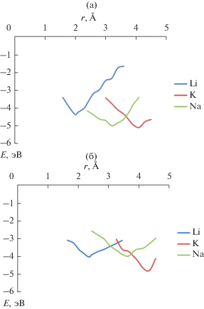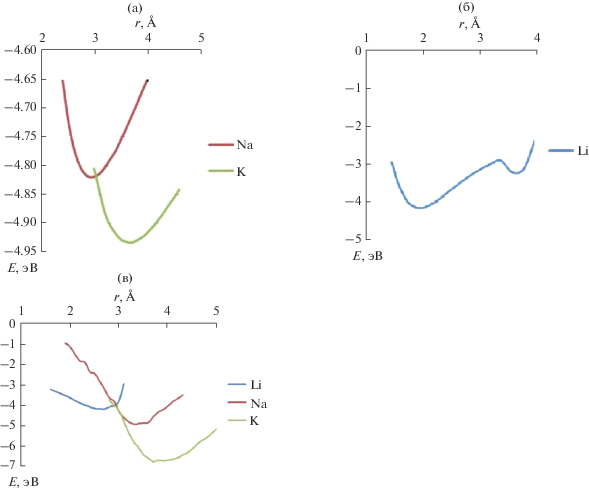 Следующим этапом исследования стало изучение взаимодействия атомов натрия, лития и калия с граничными атомами водорода и кислорода карбоксильной группы –СООН, присоединенной к поверхности бороуглеродной ВС3-нанотрубки. Моделирование процесса осуществляли с использованием метода изменения координаты реакции (на 0.1 Å) при приближении атомов щелочных металлов к атомам О или Н функциональной группы. В результате выполненных расчетов были построены энергетические кривые процессов взаимодействия атомов Li, K, Na с изучаемой поверхностно-модифицированной наносистемой (так называемые профили поверхности потенциальной энергии процессов), изображенные на рис. 3. Основные характеристики процесса взаимодействия выбранных атомов металлов с атомами О и Н карбоксильной группы, модифицирующей бороуглеродную нанотрубку, приведены в табл. 1. Из-за достаточно большого расстояния, на котором происходит взаимодействие, иллюстрируемое минимумом на кривой, можно сделать вывод, что атомы функциональной группы и щелочных металлов взаимодействуют за счет слабых сил Ван-дер-Ваальса. Это обеспечивает возможность неоднократного использования созданного сенсорного датчика, полученного путем поверхностного модифицирования карбоксильной группой бороуглеродной ВС3-нанотрубки, поскольку образование химических связей с определяемыми щелочными металлами привело бы к разрушению зонда после осуществленного взаимодействия.