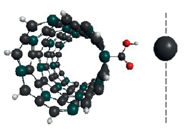 Модель сканирования произвольной поверхности, содержащей атом лития (большая темная сфера), поверхностно-модифицированной бороуглеродной нанотрубкой; пунктиром отмечена траектория движения атома лития относительно карбоксилированной нанотрубки.