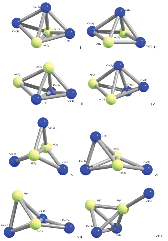 Проведенное нами квантово-химическое моделирование структур алюминий-медных и алюминий-серебряных металлокластеров с указанным выше химическим составом выявило возможность существования восьми форм как для металлокластера Al2Cu3, так и для металлокластера Al2Ag3 (рис. 1, 2). Структурные данные для Al2Cu3 представлены в табл. 1, из которой видно, что в 7 структурах реализуется прямая валентная связь Al–Al; единственным исключением является структура Al2Cu3 (II). Также в семи из восьми структур, за исключением структуры Al2Cu3 (V), имеется одна связь Cu–Cu и как минимум пять связей Al–Cu. Рассматриваемые нами металлокластеры обладают значительным числом связей металл–металл (от семи до девяти), причем в трех из восьми модификаций их число лишь на единицу меньше максимального их количества в соединениях типа Al2M3 (10) (M – металл). Относительные энергии этих структур представлены в табл. 2. Как видно из приведенных данных, наиболее устойчивой оказывается модификация Al2Cu3 (I), общее число связей металл–металл в которой равно 9. Характерно, что эта модификация обладает не самой высокой спиновой мультиплетностью (4), а более низкой (2); при этом модификации со спиновой мультиплетностью 4, а именно Al2Cu3 (II), Al2Cu3 (IV) и Al2Cu3 (VI), имеют и значительно бóльшие полные энергии, чем модификации со спиновой мультиплетностью 2.