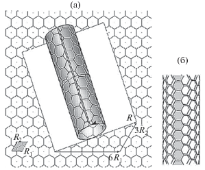 Построение нанотрубки путем скручивания ленты, вырезанной из гексагональной решетки (а), и пример нанотрубки (n, n) типа “кресло” (б).