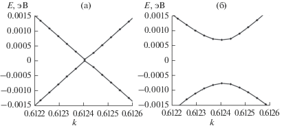 Дисперсионные кривые нанотрубки Si (5, 5) в области уровня Ферми, рассчитанные в пренебрежении (а) и с учетом спин-орбитального взаимодействия (б). Уровень Ферми при E = 0.