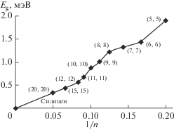 В качестве примера результатов расчетов на рис. 2 показаны энергетические зоны нанотрубки Si (5, 5) для области уровня Ферми. Результатом спин-орбитального взаимодействия является образование минищели на уровне Ферми. В отсутствие спин-орбитального взаимодействия зоны связывающих (π) и разрыхляющих (π*) состояний пересекаются на уровне Ферми. Из-за спин-орбитального взаимодействия существенно меняется вид законов дисперсии электронов в области уровня Ферми. Две пересекающиеся прямые превращаются в две параболы, одна из которых соответствует валентной зоне и обращена вниз, а другая – зоне проводимости и обращена вверх. Орбитальное вырождение в точке пересечения валентной зоны и зоны проводимости снимается, между этими состояниями образуется щель, и металлический характер зонной структуры нанотрубки, предсказываемый нерелятивистскими расчетами, разрушается; соединение оказывается узкозонным полупроводником. Для трубки (5, 5) энергия спин-орбитальной щели равна 1.89 мэВ. В табл. 1 представлены энергии спин-орбитальных щелей на уровне Ферми в нанотрубках Si (n, n) с n = 5–20. Можно видеть, что величины щелей лежат в интервале 1.89–0.34 мэВ и увеличение диаметра нанотрубки сопровождается уменьшением спин-орбитальной щели, энергия которой обратно пропорциональна индексу n (рис. 3).