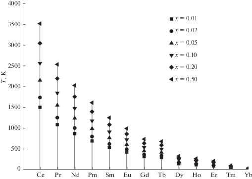 По рассчитанным значениям Тp построены их зависимости от номеров РЗЭ для пределов замещения х = 0.01–0.20 (рис. 1) и приведены критические (максимальные) температуры распада твердых растворов (х = 0.5). Эти зависимости позволяют оценить и термодинамическую стабильность твердых растворов.