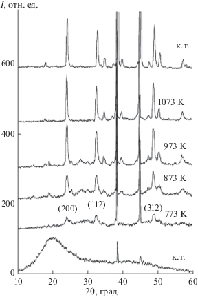 Рентгеновские дифрактограммы, полученные при синтезе YVO4 из прекурсоров, снятые при комнатной температуре (к.т.) после прокаливания при 573 (видны два сигнала эталона), 773, 873, 973 и 1073 К, а также вновь при комнатной температуре после прокаливания при 1073 К [24].