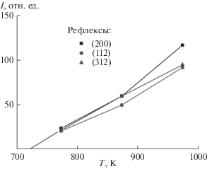 По величинам интенсивностей наиболее ярких отражений (200), (112), (312) (рис. 2) построены их зависимости от температуры (рис. 3). После экстраполяции этой зависимости до оси абсцисс определена температура начала реакции и кристаллизации YVO4, равная ~720 K.