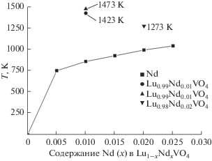 Насколько нам известно, в литературе практически нет данных по энергиям смешения и пределам замещения лютеция на РЗЭ для твердых растворов ортованадатов со структурой циркона с ограниченной смесимостью компонентов. Это, конечно, затрудняет оценку достоверности проведенных расчетов. Однако имеются данные по составам и температурам отжига твердых растворов Lu0.99Nd0.01VO4 при 1423 [27] и 1473 K [19] и Lu0.98Nd0.02VO4 при 1273 K [18]. Из графической зависимости вычисленных температур распада твердых растворов Lu1 – xNdxVO4 от мольной доли Nd (рис. 4) следует, что экспериментальные точки, отвечающие твердым растворам состава Lu0.99Nd0.01VO4 (при 1423 и 1473 K) и Lu0.98Nd0.02VO4 (при 1273 K), находятся существенно выше вычисленной кривой распада твердого раствора.