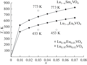 Зависимость вычисленных температур распада твердых растворов систем Lu1 – xEuxVO4 и Lu1 – xSmxVO4 от мольной доли РЗЭ, а также экспериментальные температуры двух стадий синтеза Lu0.95Eu0.05VO4 (453 и 773 К) и Lu0.97Sm0.03VO4 (453 и 773 К).