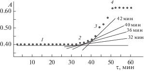 Зависимость А350= f(τ) для раствора (CF3COO)2Cd · nH2O–ТАА–ЭА, СCd(II) = 0.00200 моль/л, мольное соотношение Cd : ТАА = 1 : 4, относительно ЭА, l = 1.00 см.