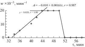 Зависимости w = f(τ) для раствора (CF3COO)2Cd · nH2O–ТАА–ЭА, СCd(II) = 0.00200 моль/л, мольное соотношение Cd : ТАА = 1 : 4.