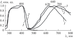 Как показали проведенные исследования, времени, в течение которого коллоидные растворы при мольных соотношениях Cd : ТАА < 1 : 4 сохраняют устойчивость, достаточно для их термического отверждения полимеризацией метилметакрилата в блоке. Для синтеза образцов полимерных композиций выбраны составы с соотношением Cd : ТАА = 1 : 1 и 1 : 2. При нагревании таких растворов при 70–90°С переход в коллоидное состояние происходит в течение 20 мин. Процесс полимеризации композиции объемом до 10 мл до стеклообразного состояния занимает несколько часов. Оптическая прозрачность стеклообразных композиций в области спектра >500 нм достигает 92% (5 мм). Полимерные композиции люминесцируют в видимой и ближней ИК-области спектра (рис. 6, спектры 1–3). Люминесценция композиций связана с дефектностью поверхности кристаллов CdS. На это указывает длинноволновое положение спектральной полосы. Возникновение люминесценции объясняется образованием акцепторных уровней энергии в запрещенной зоне кристаллов CdS. Интенсивность люминесценции полимерных композиций значительно больше интенсивности люминесценции коллоидных растворов. Возбуждение люминесценции происходит излучением ближнего ультрафиолета (рис. 6, спектры 1 ' и 2 '). Значительная ширина полос объясняется неоднородностью центров люминесценции и дисперсностью образующихся частиц. Увеличение количества комплексов на поверхности частиц приводит к батохромному смещению полосы люминесценции. Противоположное смещение полосы наблюдается при увеличении времени полимеризации и “отжига” полимерных образцов. Это связано с разрушением комплексов и продолжающимся образованием CdS в процессе нагревания при полимеризации и “отжиге” полимерных образцов. Рост концентрации ТАА (Cd : ТАА = 1 : 1 и 1 : 2) приводит к повышению интенсивности люминесценции. Это объясняется увеличением выхода H2S и, соответственно, ростом концентрации кристаллов CdS.