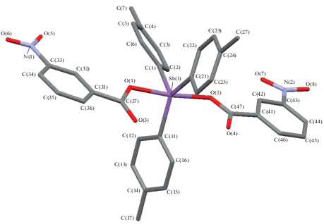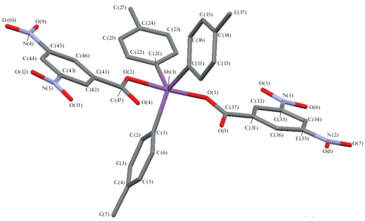 Синтез п-Tol3Sb[OC(O)C6H4(NO2-3)]2 (I). Смесь 100 мг (0.253 ммоль) трис(пара-толил)сурьмы, 85 мг (0.506 ммоль) 3-нитробензойной кислоты и 33 мг (0.253 ммоль) 70%-ного раствора гидропероксида третичного бутила в 30 мл диэтилового эфира выдерживали при 20°С 24 ч. После медленного удаления растворителя получили 180 мг (98%) бесцветных кристаллов c tпл = 236°C.