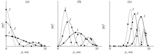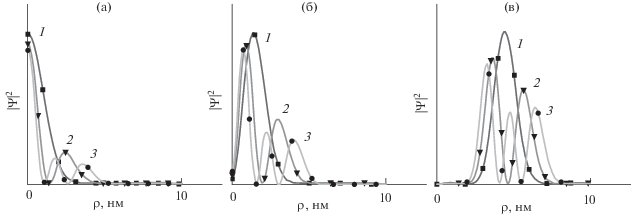 Зависимость нормированных волновых функций ${{\left| {{{\Psi }_{{n,m}}}} \right|}^{2}}$ от радиуса ρ в квантовой яме цилиндрической геометрии с усеченным параболическим профилем потенциальной энергии (20). Кривые 1, 2, 3 соответствуют модам с радиальными квантовыми числами $n = 0,1,2,....$ Кривые на рис. 2а, 2б, 2в отвечают модам с магнитными квантовыми числами $m = 0,1,10$ соответственно. Маркеры ◼, ⚫ и ▼ соответствуют аналитическим решениям (22).