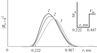 На рис. 3 приведена зависимость нормированной функции ${{\left| {{{{\bar {R}}}_{{n = 0}}}(r)} \right|}^{2}},$ которая является радиальной частью волновых функций ${{\Psi }_{{n = 0,l}}}$ = = ${{\bar {R}}_{{n = 0}}}(r)P_{l}^{m}(\theta )\exp (im\varphi ),$ от радиуса $r$ квантового сферического слоя (в фуллерене), где радиальная часть удовлетворяет условию нормировки: