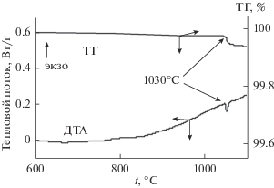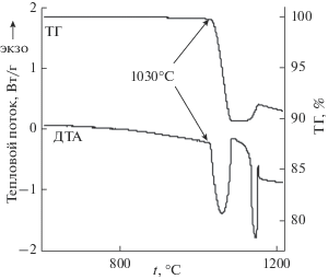 Согласно полученным данным, при 1030°С наблюдается убыль массы CuO на 10.06%, сопровождаемая эндотермическим эффектом 21.57 кДж/моль, обусловленная процессом разложения оксида меди: