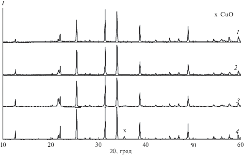 $2{\text{C}}{{{\text{u}}}_{2}}{\text{O}} \leftrightarrow 4{\text{Cu}} + {{{\text{O}}}_{2}} \uparrow ,$Таким образом, данные термического анализа показывают, что температура отжига стехиометрической смеси оксидов при твердофазном синтезе Zn2 – 2xCu2xSiO4 не должна превышать 1030°С. Поэтому была разработана следующая методика керамической технологии получения медьзамещенного виллемита: навески оксидов SiO2, ZnO и CuO в необходимых пропорциях последовательно отжигали при 800, 900, 1000 и 1020°С в течение 20 ч на каждой ступени с промежуточным перетиранием. Контроль фазового состава осуществляли методом РФА.