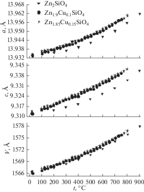 Для определения протяженности твердого раствора Zn2 – 2xCu2xSiO4 были синтезированы составы с содержанием меди х = 0, 0.025, 0.050, 0.075, 0.090, 0.125, 0.150, 0.200. На рис. 2 представлены рентгенограммы образцов Zn2SiO4, Zn1.9Cu0.1SiO4, Zn1.85Cu0.15SiO4 и Zn1.82Cu0.18SiO4. Протяженность твердого раствора Zn2 – 2xCu2xSiO4 со структурой виллемита составляет 7.5 ат. %, поскольку для х > 0.075 фиксируются не только дифракционные максимумы, относящиеся к структуре виллемита [24], но и рефлексы, соответствующие оксиду меди(II). Допированные однофазные образцы имеют слабую сиренево-голубую окраску, которая усиливается с ростом х. Параметры элементарной ячейки Zn2 – 2xCu2xSiO4 при комнатной температуре остаются практически неизменными с увеличением концентрации допанта (табл. 1). При нагревании кристаллическая решетка ортосиликата цинка монотонно расширяется (рис. 3), наибольшие трансформации происходят вдоль оси с (αс = 3.47 × 10–6 1/град). Кристаллическая решетка твердых растворов Zn2 – 2xCu2xSiO4 становится более подвижной по сравнению с таковой для исходного ортосиликата цинка, о чем свидетельствуют растущие значения линейных и объемных коэффициентов термического расширения (табл. 1).