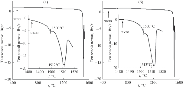 Для установления влияния допирования на температуру плавления Zn2 – 2xCu2xSiO4 были исследованы образцы Zn2SiO4 и Zn1.85Cu0.15SiO4 (рис. 4). На кривой нагревания ДТА Zn2SiO4 наблюдаются два эндотермических эффекта при 1500 (0.13 кДж/моль) и 1512°С (106.44 кДж/моль). Аналогичное термическое поведение демонстрирует Zn1.85Cu0.15SiO4 – эндоэффекты при 1503°С (0.24 кДж/моль) и 1513°С (131.86 кДж/моль). Более энергоемкий эндоэффект для обоих образцов свидетельствует об их плавлении [14]. Поскольку силикат Zn2SiO4 кристаллизуется в двух модификациях: низкотемпературной α-Zn2SiO4 со структурой виллемита и высокотемпературной β-Zn2SiO4 [25, 26], можно утверждать, что эндоэффект при 1500°С (рис. 4а) обусловлен фазовым переходом α → β, а незначительная величина теплового эффекта указывает на деформационный характер фазового перехода [27]. Для допированного образца температура фазового перехода α → β равна 1503°С (рис. 4б). Полученные результаты термического анализа свидетельствуют о том, что замещение ионов цинка на ионы меди в Zn2SiO4 практически не влияет на температуру и характер фазовых превращений (табл. 1).