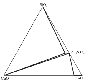 Показано, что максимальная температура отжига смесей оксидов для получения однофазных образцов Zn2 – 2xCu2xSiO4 лимитирована термической устойчивостью оксида меди(II), который разлагается при 1030°С. Установлено, что твердый раствор ограничен составом Zn1.85Cu0.15SiO4 (x = 0.075). Параметры элементарной ячейки в области гомогенности твердого раствора практически не зависят от концентрации ионов меди. Кристаллическая решетка твердых растворов Zn2 – 2xCu2xSiO4 становится более подвижной по сравнению с таковой для исходного ортосиликата цинка, о чем свидетельствуют растущие значения линейных и объемных коэффициентов термического расширения. Температуры плавления Zn2 – 2xCu2xSiO4 не зависят от величины х, остаются практически неизменными и составляют 1512 ± 1°С. При температурах, близких к температуре плавления, зафиксирован фазовый переход α-Zn2 – 2xCu2xSiO4 → β-Zn2 – 2xCu2xSiO4. Триангуляция фазовой диаграммы системы ZnO–SiO2–CuO показала, что линиями двухфазных равновесий она разбивается на пять вторичных треугольников.