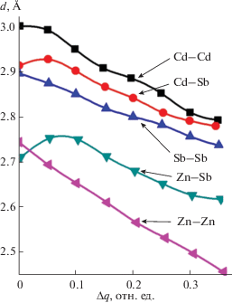 Далее с учетом казанных выше замечаний рассчитаны ионные радиусы $R_{{u{\text{Cd}}}}^{i}$, $R_{{u{\text{Sb}}}}^{i}$ и $\Delta {{q}_{i}}$ для соединений Cd–Sb, а также $R_{{u{\text{Zn}}}}^{i}$, $R_{{u{\text{Sb}}}}^{i}$ и $\Delta {{q}_{i}}$ для соединений Zn–Sb.