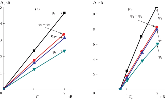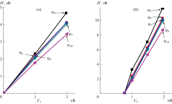 $D_{{A - B}}^{i} = \frac{{{{C}_{1}}\left( {R_{{uA}}^{0} + R_{{uB}}^{0}} \right)}}{{\left( {{\text{tg}}{{\alpha }_{A}} + {\text{tg}}{{\alpha }_{B}}} \right)}}\left( {\frac{{{{C}_{2}}{{d}_{i}}}}{{d_{i}^{2} - {{R}_{{uA}}}{{R}_{{uB}}}}} - \frac{1}{{{{d}_{i}}}}} \right),$С1 – коэффициент, отражающий взаимосвязь размерных и энергетических характеристик межатомного взаимодействия, таких как потенциалы ионизации, эффекты экранирования, электроотрицательность с эффективными радиусами и межатомными расстояниями. В случае использования несистемных единиц, когда расстояние измеряется в Å, С1 измеряется в эВ.