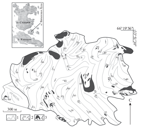 Структурный облик о-ва Виченная Луда (рис. 1) определяется сильно дислоцированной толщей гнейсов, осложненной мелкими лежачими складками с северо-восточным пологим погружением шарнира, с согласными телами метаморфизованных пород основного состава. Наложенные сдвиговые зоны маломощные, они не превышают 20 м и прослеживаются по простиранию до 100–150 м.