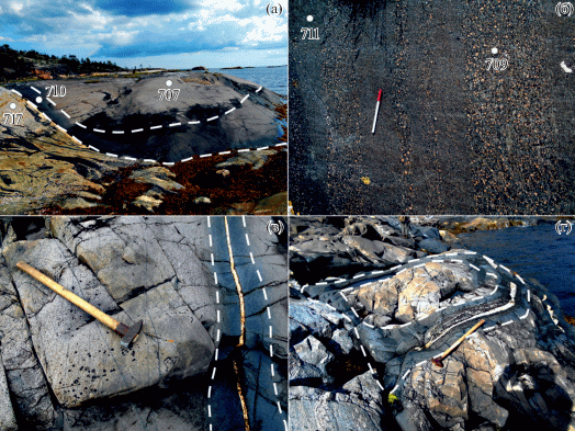 Фотографии будин метагаббро (эклогитов) о-ва Виченная Луда. (а) – крупная будина с каймой амфиболитов, описанная в статье; (б) – прослои гранатовых амфиболитов в будине; (в) – оторочка амфиболита вокруг кварц-полевошпатового прожилка в будине; (г) – мелкая будина с каймой амфиболитов. Белыми кружками показаны точки отбора проб.