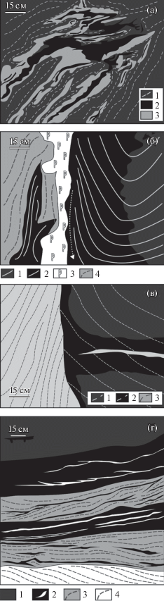 Зарисовки типичных контактов основных пород и вмещающих гнейсов. (а) Характер взаимоотношения обособлений амфиболитов (2), эклогитов (3) в будине метагаббро (1). Пунктирной кривой обозначена неясно проявленная минеральная линейность. (б) Характер контакта будины метагаббро с обособлением пегматоидного материала в полости раскрытия: 1 – метагаббро, 2 – амфиболит, 3 – пегматиодное обособление Kfs-Pl-Qz состава, 4 – гнейс. Кривыми означены минеральная линейность по лейкократовым минералам (сплошными в метагаббро и амфиболитах, пунктирными – в гнейсах). Стрелкой показано направление вращения будины в гнейсах. (в) Характер контакта будины метагаббро со срезанием полосчатости в гнейсах: 1 – метагаббро, 2 – амфиболит, 3 – гнейс. Пунктирной кривой обозначена ориентировка минеральной линейности (на рис. 2в, 2г). (г) Рассланцованный контакт будины метагаббро с гнейсами: 1 – метагаббро (край будины), 2 – амфиболиты, в том числе с Qz-Pl лейкосомами, 3 – гнейсы рассланцованные, 4 – гнейсы.
