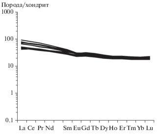 Содержания петрогенных (главных) элементов в породах были проанализированы рентгено-спектральным флюоресцентным методом (XRF) на многоканальном спектрометре ARL-9800 по стандартной методике (ВСЕГЕИ, Санкт-Петербург). Нижний предел определения оксидов петрогенных элементов составляет 0.01–0.05%. Валовые анализы пород на редкие и редкоземельные элементы (REE) проводились методом масс-спектрометрии с индуктивно-связанной плазмой (ICP-MS) на квадрупольном масс-спектрометре ELAN-DRC-6100 по стандартной методике (ВСЕГЕИ). При этом относительная погрешность определения элементов не превышает 5–10%.
