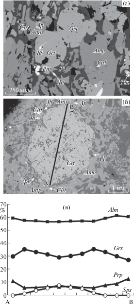 Зональность гранатов по редким элементам была установлена и в других проявлениях эклогитов в БПП. Для эклогитов в северо-западной части этой структуры (салминских эклогитов) были описаны наложенные процессы амфиболизации (амфиболиты при этом образуют кайму будины, аналогичную рассматриваемой в настоящей работе) и гранатизации (Мельник, 2015). При этом гранаты из апоэклогитовых гранатита и амфиболита по составу отличаются от граната из салминского эклогита более высоким содержанием Alm и меньшей концентрацией Prp компонента (Скублов и др., 2011б; Мельник, 2015). Спектры распределения REE в гранатах из гранатита и Grt-Cpx амфиболита характеризуются выпуклой формой за счет обогащения LREE и MREE, отличаясь от сильно дифференцированных спектров распределения REE (с увеличением от LREE к HREE) в гранатах из эклогита (Мельник, 2015). Гранаты из гранатита и амфиболита обеднены Cr в 2–8 раз по сравнению с гранатами из эклогита.