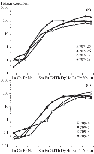 Аналогичные выпуклые спектры были установлены в гранатах с проградной зональностью из эклогитов Атбашинского хребта, Южный Тянь-Шань (Волкова и др., 2014). Появление выпуклых в области MREE спектров авторы связывают с равновесной кристаллизацией соответствующих зон граната с омфацитом. В то же время обогащение гранатов из эклогитов комплекса Церматт–Саас-Фе в Альпах Lu, Yb, Tm ± Er в центральной части и Sm, Eu, Gd, Tb ± Dy в краевой части зерен авторы склонны объяснять не рэлеевским фракционированием, сопровождаемым реакциями распада сосуществующих с гранатом минералов, а как результат диффузионного перераспределения REE, при котором поглощение гранатом REE ограничено их диффузией в матрице породы (Skora et al., 2006).