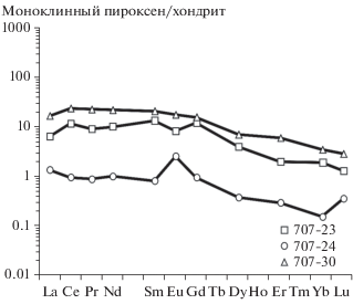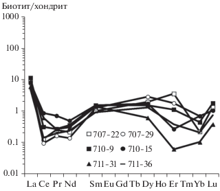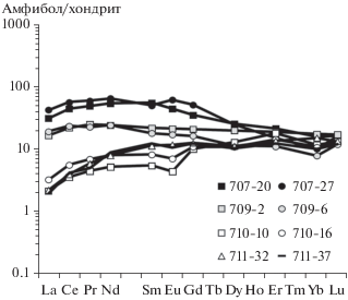 Содержание редкоземельных (REE) и редких элементов в минералах определялось на ионном микрозонде Cameca IMS-4f (ЯФ ФТИАН) по методике, приведенной в (Соболев, Батанова, 1995). Условия съемки: используется первичный пучок ионов $^{{{\text{16}}}}{\text{О}}_{2}^{ - },$ диаметр которого составляет примерно 15–20 мкм; ток ионов 5–7 нА; ускоряющее напряжение первичного пучка 15 кэВ. Каждое измерение состояло из трех циклов, что позволяло оценить индивидуальную погрешность измерения. Общее время анализа одной точки в среднем составляло 30 мин. Размер исследуемого участка минерала не превышал в диаметре 15–20 мкм; относительная ошибка измерения для большинства элементов составляла 10–15%; порог обнаружения элементов в среднем равен 10 ppb. Редкоэлементный состав породообразующих минералов определялся в тех же точках, что и анализ главных элементов на электронном микрозонде. При построении спектров распределения REE составы минералов нормировались на состав хондрита СI (McDonough, Sun, 1995). Символы минералов приведены по (Whitney, Evans, 2010).