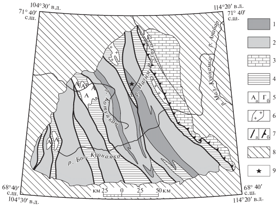 Схема геологического строения Анабарского щита. 1–3 – метаморфические образования архея и раннего протерозоя: 1 – далдынская серия, 2 – верхнеанабарская серия, 3 – хапчанская серия; 4 – раннепротерозойские зоны смятия; 5 – интрузивные образования: а – анортозиты, б – габброиды; 6 – автохтонные и параавтохтонные гранитоиды; 7 – главные разломы: а – крутопадающие, б – надвиги; 8 – платформенный чехол; 9 – участок с эоархейскими кристаллосланцами, координаты: 70°26′49.9′′ с.ш., 109°31′14.7′′ в.д.