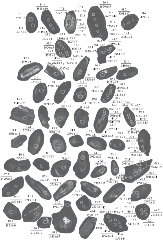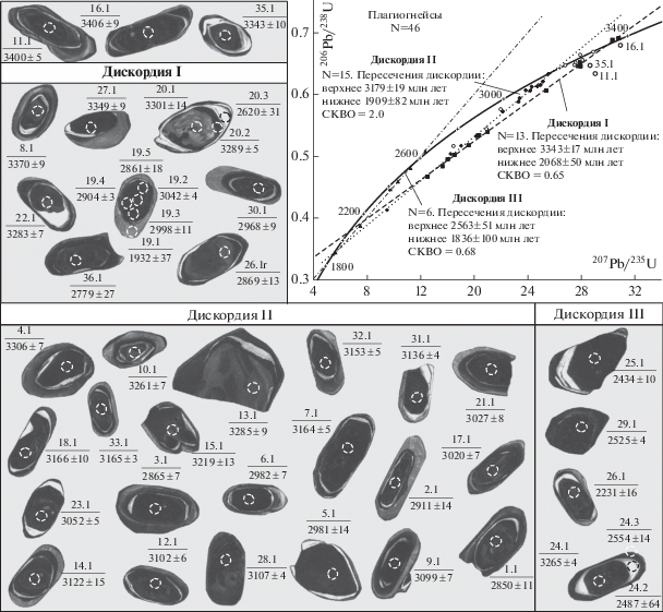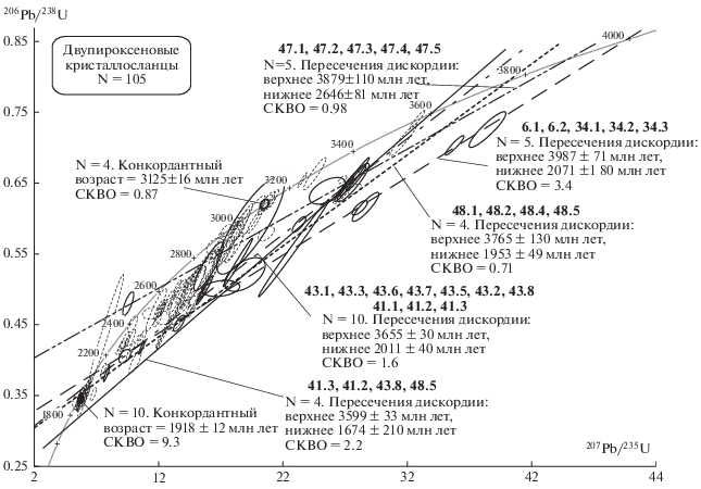 Обилие разновозрастного конкордантного циркона обычно связано с осадочным протолитом, обогащенным детритовым цирконом разного возраста, рециклингом более древнего корового материала, захватом мафическими породами циркона из вмещающих пород. Кроме того, для глубокометаморфизованных пород снижение возраста по линии конкордии может объясняться потерями радиогенного свинца, в связи с длительным нахождением пород в условиях гранулитовой фации метаморфизма (O’Brien, Miller, 2014). В случае реститового генезиса мафических линз их первичные породы могли иметь более кислый (средний) состав и тогда можно объяснить обилие циркона в мафических породах, в которых теоретически цирконий должен был находиться в бадделеите в связи с низким содержанием SiO2.