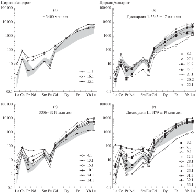 На диаграмме рис. 12а выделяется две совокупности анализов. В наиболее древних цирконах (3987 и 3575 млн лет, точки анализов 6.1 и 12.1 соответственно) отношение 176Lu/177Hf составляет 0.000784–0.000789, но в зерне циркона в точке анализа 4.1 (3567 млн лет) отношение значительно выше 0.001176 и наиболее высокое 0.001838 в зерне с анализом в точке 2.1 (3243 млн лет). Эти четыре зерна в нижней части диаграммы 176Lu/177Hf–176Hf/177Hf образуют тренд, вероятно, связанный с метаморфическими изменениями (включая анатексис) эоархейских магматических пород. Положительная корреляция 176Lu/177Hf и 176Hf/177Hf является свидетельством о изменениях циркона в закрытой системе (Chen et al., 2010). С уменьшением возраста цирконов отмечается рост величины отношения 176Hf/177Hf, начиная с 3287 млн лет и менее, цирконы характеризуются более высоким отношением 176Hf/177Hf, отчасти более низкими величинами отношений 176Lu/177Hf и концентрируются в верхней части диаграммы (рис. 12а). Это результат изменений первичного циркона, поскольку вновь образующийся циркон всегда имеет более высокие значения отношения 176Hf/177Hf, чем первичный циркон пород (Gerdes, Zeh, 2009). Увеличение 176Hf/177Hf происходит при метаморфизме и анатексисе в результате изотопного обмена между цирконом и минералами/расплавом, поскольку породообразующие минералы и расплав имеют более высокое отношение Lu/Hf и, следовательно, более радиогенный состав Hf (Chen et al., 2010). Наиболее низкие величины отношения 176Lu/177Hf = 0.000411 наблюдаются в зерне в точке анализа 8.1 (3287 млн лет) и в анализах зерен 5.1 (0.000438) и 13.1 (0.000473), возраст которых 3118 и 3114 млн лет соответственно. Видимо, при перекристаллизации циркона в эти периоды вместе с флюидами происходило поступление ювенильного мантийного вещества в процессе формирования новой коры. В ходе последующих изменений циркона происходило увеличение изотопных отношений 176Lu/177Hf, в результате чего анализы образуют область положительно коррелирующих значений в левой верхней части рис. 12a. С уменьшением возраста циркона происходит слабое уменьшение величин отношения (176Hf/177Hf)i, промежуточных между значениями хондритового резервуара и коры (рис. 12б). Положительная величина εHf(T) = +3.7 и близкие значения модельного возраста THf(DM) = 3.95 млрд лет и возраста коровой экстракции ${\text{T}}_{{{\text{Hf}}}}^{{\text{C}}}$ = 3.93 млрд лет отмечаются только для циркона с возрастом 3987 млн лет. Весь более поздний циркон отличается отрицательными величинами εHf(T) (табл. 6), указывающими на переработку ранее существовавшей коры. При этом циркон, возраст которого 3575 и 3567 млн лет, характеризуется наиболее древним модельным возрастом THf(DM) = 3.99–3.93 млрд лет и хадейским возрастом экстракции коры ${\text{T}}_{{{\text{Hf}}}}^{{\text{C}}}$ = 4.24–4.14 млрд лет. Циркону с возрастом 3287 млн лет и менее соответствует в основном палеоархейский модельный возраст 3585–3448 млн лет, в двух случаях – полученный по анализам в точках 2.1 и 13.1 – эоархейский (3716 и 3718 млн лет). В палео- и мезоархейском цирконе моложе 3287 млн лет преобладают эоархейские величины возраста экстракции коры, хадейские значения наблюдаются только в зерне в точке анализа 13.1 из популяции циркона с конкордантным возрастом 3125 ± 16 млн лет и в зернах в точках 17.1 и 31.1 с дискордантными значениями 2713 и 2410 млн лет.
