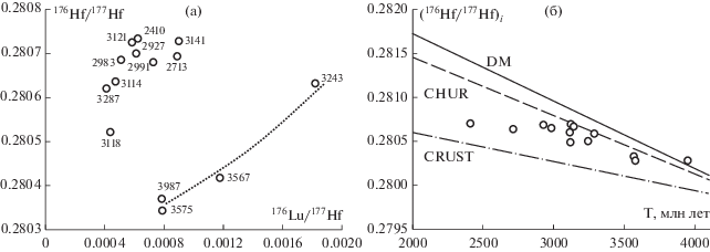 Диаграммы 176Lu/177Hf–176Hf/177Hf (a) и T–(176Hf/177Hf)i (б) для цирконов из мафических кристаллосланцев (пр. 607). На диаграмме (а) цифрами обозначен 207Pb-206Pb возраст, точечной линией – тренд метаморфических изменений эоархейского циркона. DM – деплетированная мантия, CHUR – хондритовый резервуар, CRUST – кора.